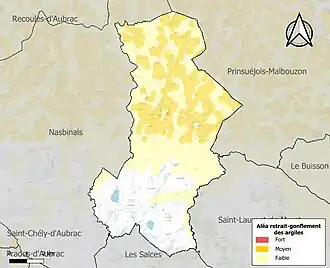 Le retrait-gonflement des sols argileux est susceptible d'engendrer des dommages importants aux bâtiments en cas d’alternance de périodes de sécheresse et de pluie. 29,1 % de la superficie communale est en aléa moyen ou fort (15,8 % au niveau départemental et 48,5 % au niveau national). Sur les 44 bâtiments dénombrés sur la commune en 2019, 14 sont en aléa moyen ou fort, soit 32 %, à comparer aux 14 % au niveau départemental et 54 % au niveau national. Une cartographie de l'exposition du territoire national au retrait gonflement des sols argileux est disponible sur le site du BRGM[31],[Carte 2].