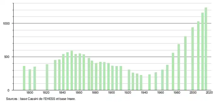 L'évolution du nombre d'habitants est connue à travers les recensements de la population effectués dans la commune depuis 1793. Pour les communes de moins de 10 000 habitants, une enquête de recensement portant sur toute la population est réalisée tous les cinq ans, les populations de référence des années intermédiaires étant quant à elles estimées par interpolation ou extrapolation[4]. Pour la commune, le premier recensement exhaustif entrant dans le cadre du nouveau dispositif a été réalisé en 2006[5].