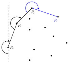 Plus formellement, il s'agit pour chaque nouveau sommet de l'enveloppe convexe trouvé, de chercher le suivant en calculant le point d'angle polaire minimal par rapport à .