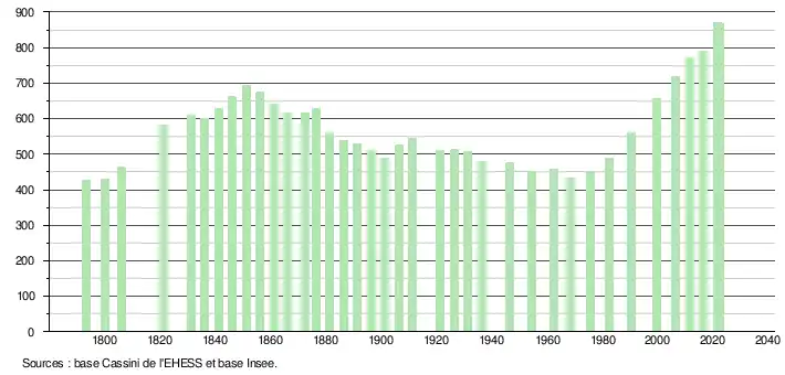 L'évolution du nombre d'habitants est connue à travers les recensements de la population effectués dans la commune depuis 1793. Pour les communes de moins de 10 000 habitants, une enquête de recensement portant sur toute la population est réalisée tous les cinq ans, les populations de référence des années intermédiaires étant quant à elles estimées par interpolation ou extrapolation[18]. Pour la commune, le premier recensement exhaustif entrant dans le cadre du nouveau dispositif a été réalisé en 2006[19].
