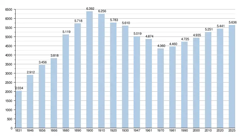 Elle comptait, au , 5 639 habitants (2 793 hommes et 2 846 femmes) [16], soit une densité de 186,97 habitants/km² pour une superficie de 30,16 km²[17].