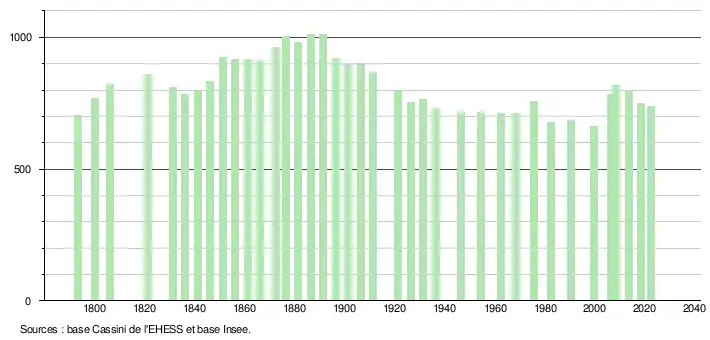 L'évolution du nombre d'habitants est connue à travers les recensements de la population effectués dans la commune depuis 1793. Pour les communes de moins de 10 000 habitants, une enquête de recensement portant sur toute la population est réalisée tous les cinq ans, les populations de référence des années intermédiaires étant quant à elles estimées par interpolation ou extrapolation[36]. Pour la commune, le premier recensement exhaustif entrant dans le cadre du nouveau dispositif a été réalisé en 2008[37].