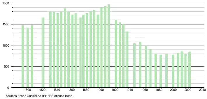 En 2022, la commune comptait 853 habitants[Note 3], en évolution de +7,16 % par rapport à 2016 (Corrèze : −0,59 %, France hors Mayotte : +2,11 %).