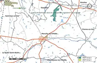L’inventaire des zones naturelles d'intérêt écologique, faunistique et floristique (ZNIEFF) a pour objectif de réaliser une couverture des zones les plus intéressantes sur le plan écologique, essentiellement dans la perspective d’améliorer la connaissance du patrimoine naturel national et de fournir aux différents décideurs un outil d’aide à la prise en compte de l’environnement dans l’aménagement du territoire. Le territoire communal de Marcilly-en-Villette comprend une ZNIEFF[INPN 3] désignée « Étangs des Buffières, neuf, de la briquèterie, buisson et de la Chevrie ». Cette zone, de type 2[Note 2]. D'une superficie de 103 hectares, elle est située dans la partie nord de la commune[DREAL 1]. Son altitude est de 120 m[INPN 4]. En limite Nord des étangs solognots et proche de la Loire, la chaîne d'étangs des Buffières, Neuf, de la Briqueterie, Buisson et de la Chevrie joue un rôle écologique de premier ordre en tant que corridor entre le val de Loire et la Sologne. Les étangs de cette chaîne sont donc fréquentés par de nombreuses espèces d'oiseaux et l'ensemble de la zone représente, pour cette partie de la Sologne, l'un des sites les plus caractéristiques, avec ses roselières de ceinture assez vastes et ses pourtours de saules notamment. L'étang des Buffières, par exemple, est l'un des rares sites du département pour la reproduction régulière (depuis au moins trente ans) du canard souchet. D'autres anatidés y nichent aussi : canard chipeau, fuligule milouin et fuligule morillon ainsi que le héron pourpré et le râle d'eau[INPN 5].