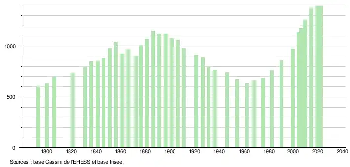 L'évolution du nombre d'habitants est connue à travers les recensements de la population effectués dans la commune depuis 1793. Pour les communes de moins de 10 000 habitants, une enquête de recensement portant sur toute la population est réalisée tous les cinq ans, les populations de référence des années intermédiaires étant quant à elles estimées par interpolation ou extrapolation[26]. Pour la commune, le premier recensement exhaustif entrant dans le cadre du nouveau dispositif a été réalisé en 2004[27].