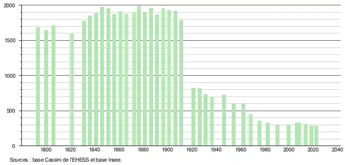 L'évolution du nombre d'habitants est connue à travers les recensements de la population effectués dans la commune depuis 1793. Pour les communes de moins de 10 000 habitants, une enquête de recensement portant sur toute la population est réalisée tous les cinq ans, les populations de référence des années intermédiaires étant quant à elles estimées par interpolation ou extrapolation[25]. Pour la commune, le premier recensement exhaustif entrant dans le cadre du nouveau dispositif a été réalisé en 2008[26].