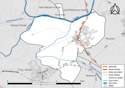 Les communes limitrophes sont Moussan, Narbonne, Névian, Raissac-d'Aude, Saint-Marcel-sur-Aude et Saint-Nazaire-d'Aude.