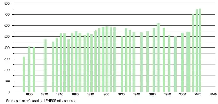 L'évolution du nombre d'habitants est connue à travers les recensements de la population effectués dans la commune depuis 1793. Pour les communes de moins de 10 000 habitants, une enquête de recensement portant sur toute la population est réalisée tous les cinq ans, les populations de référence des années intermédiaires étant quant à elles estimées par interpolation ou extrapolation[24]. Pour la commune, le premier recensement exhaustif entrant dans le cadre du nouveau dispositif a été réalisé en 2008[25].