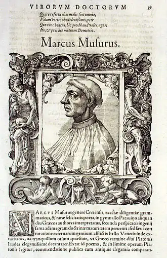 Marcus Musurus ( grec moderne : Μάρκος Μουσοῦρος), ou Marc Musurus, en italien Marco Musuro, né à Réthymnon en Crète en 1470, mort le , est un helléniste et humaniste d'origine grecque. Musurus étudie à Florence où il apprend le grec ancien et le latin. Sa connaissance du latin, peu commune à l'époque pour un Grec, faisait l'étonnement d'Érasme. Il édite plusieurs auteurs anciens, grecs ou latins, et travaille auprès de l'imprimeur Alde Manuce. Il est nommé par le Sénat de Venise censeur des ouvrages imprimés en grec puis titulaire de la chaire de grec. Il occupe ensuite la chaire de grec à l'université de Padoue. Converti au catholicisme, il est nommé archevêque de Monemvasie (ville sous protectorat vénitien), mais meurt en 1517 avant d'exercer la fonction[1].