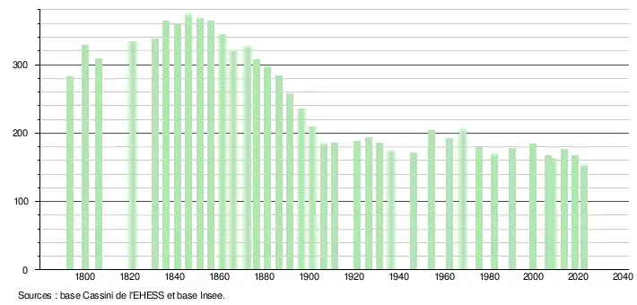 L'évolution du nombre d'habitants est connue à travers les recensements de la population effectués dans la commune depuis 1793. Pour les communes de moins de 10 000 habitants, une enquête de recensement portant sur toute la population est réalisée tous les cinq ans, les populations de référence des années intermédiaires étant quant à elles estimées par interpolation ou extrapolation[21]. Pour la commune, le premier recensement exhaustif entrant dans le cadre du nouveau dispositif a été réalisé en 2008[22].