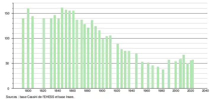 L'évolution du nombre d'habitants est connue à travers les recensements de la population effectués dans la commune depuis 1793. Pour les communes de moins de 10 000 habitants, une enquête de recensement portant sur toute la population est réalisée tous les cinq ans, les populations de référence des années intermédiaires étant quant à elles estimées par interpolation ou extrapolation[16]. Pour la commune, le premier recensement exhaustif entrant dans le cadre du nouveau dispositif a été réalisé en 2005[17].