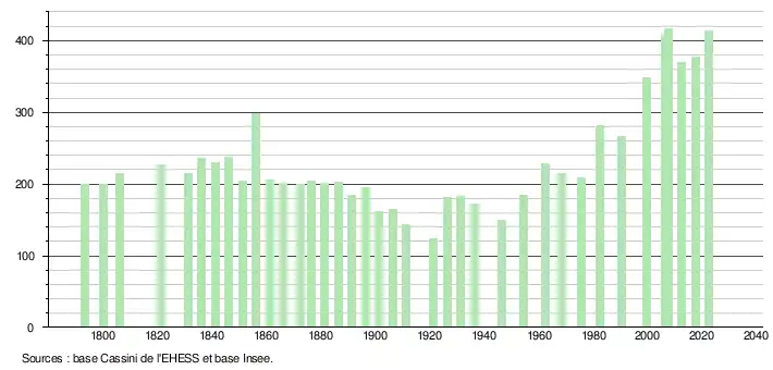 L'évolution du nombre d'habitants est connue à travers les recensements de la population effectués dans la commune depuis 1793. Pour les communes de moins de 10 000 habitants, une enquête de recensement portant sur toute la population est réalisée tous les cinq ans, les populations de référence des années intermédiaires étant quant à elles estimées par interpolation ou extrapolation[21]. Pour la commune, le premier recensement exhaustif entrant dans le cadre du nouveau dispositif a été réalisé en 2007[22].