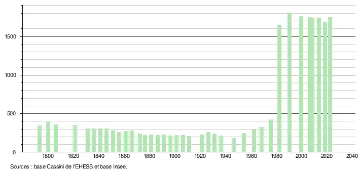L'évolution du nombre d'habitants est connue à travers les recensements de la population effectués dans la commune depuis 1793. Pour les communes de moins de 10 000 habitants, une enquête de recensement portant sur toute la population est réalisée tous les cinq ans, les populations de référence des années intermédiaires étant quant à elles estimées par interpolation ou extrapolation[25]. Pour la commune, le premier recensement exhaustif entrant dans le cadre du nouveau dispositif a été réalisé en 2008[26].