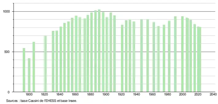 L'évolution du nombre d'habitants est connue à travers les recensements de la population effectués dans la commune depuis 1793. Pour les communes de moins de 10 000 habitants, une enquête de recensement portant sur toute la population est réalisée tous les cinq ans, les populations de référence des années intermédiaires étant quant à elles estimées par interpolation ou extrapolation[24]. Pour la commune, le premier recensement exhaustif entrant dans le cadre du nouveau dispositif a été réalisé en 2005[25].