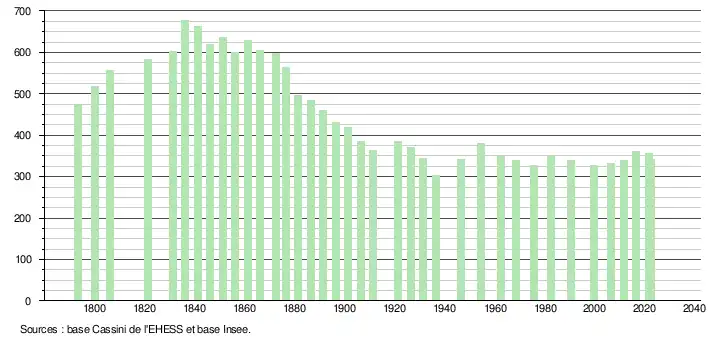 L'évolution du nombre d'habitants est connue à travers les recensements de la population effectués dans la commune depuis 1793. Pour les communes de moins de 10 000 habitants, une enquête de recensement portant sur toute la population est réalisée tous les cinq ans, les populations de référence des années intermédiaires étant quant à elles estimées par interpolation ou extrapolation[36]. Pour la commune, le premier recensement exhaustif entrant dans le cadre du nouveau dispositif a été réalisé en 2006[37].