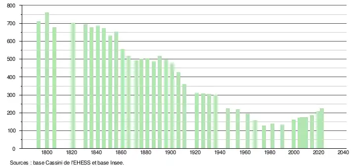 L'évolution du nombre d'habitants est connue à travers les recensements de la population effectués dans la commune depuis 1793. Pour les communes de moins de 10 000 habitants, une enquête de recensement portant sur toute la population est réalisée tous les cinq ans, les populations de référence des années intermédiaires étant quant à elles estimées par interpolation ou extrapolation[15]. Pour la commune, le premier recensement exhaustif entrant dans le cadre du nouveau dispositif a été réalisé en 2004[16].