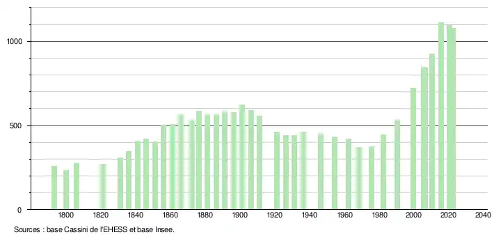 L'évolution du nombre d'habitants est connue à travers les recensements de la population effectués dans la commune depuis 1793. Pour les communes de moins de 10 000 habitants, une enquête de recensement portant sur toute la population est réalisée tous les cinq ans, les populations de référence des années intermédiaires étant quant à elles estimées par interpolation ou extrapolation[17]. Pour la commune, le premier recensement exhaustif entrant dans le cadre du nouveau dispositif a été réalisé en 2005[18].