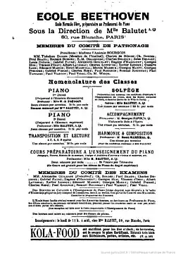 En novembre 1893[2] elle crée « l'École Beethoven » au sein de son vaste domicile du 80 rue Blanche à Paris, avec deux objectifs : permettre aux jeunes filles de faire des études musicales complètes, mais aussi, et peut-être surtout, dans la mesure où l'idée est une réelle innovation[9], instituer une école normale de formation pour futures enseignantes de piano[10]. Le cursus, nommé « cours préparatoire à l'enseignement du piano », est ainsi organisé en plusieurs enseignements et propose des séances de pédagogie, théorie, histoire de la musique, analyse et audition d’œuvres[8]. En fin de cursus un examen permet l'obtention d'un « certificat de capacité », validé par des grands maîtres de l'instrument et de la composition musicale. Sont par exemple au jury pour les examens de 1895 Guilmant, Leroux, Maréchal, Pierné, René et Vidal[11].