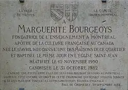 Marguerite Bourgeoys, en religion sœur Marguerite du Saint-Sacrement, née à Troyes, en France, le et morte le à Ville-Marie (Montréal) au Canada (Nouvelle-France), est la première enseignante de la ville et la fondatrice de la congrégation de Notre-Dame de Montréal, première communauté de religieuses à vocation apostolique (en d'autres mots non cloîtrées) de la colonie.