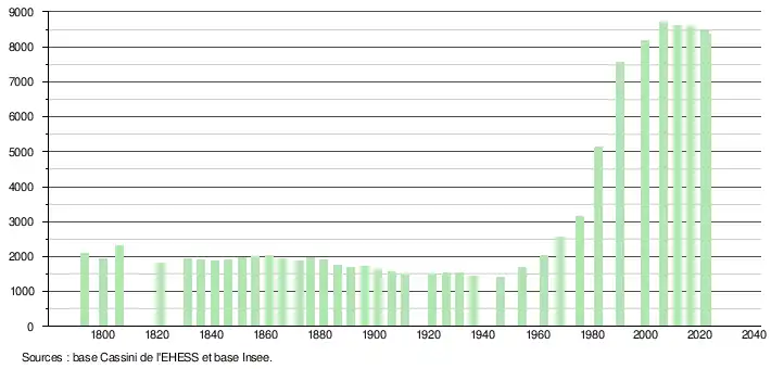 L'évolution du nombre d'habitants est connue à travers les recensements de la population effectués dans la commune depuis 1793. Pour les communes de moins de 10 000 habitants, une enquête de recensement portant sur toute la population est réalisée tous les cinq ans, les populations de référence des années intermédiaires étant quant à elles estimées par interpolation ou extrapolation[32]. Pour la commune, le premier recensement exhaustif entrant dans le cadre du nouveau dispositif a été réalisé en 2006[33].