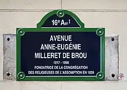 L'avenue Anne-Eugénie-Milleret-de-Brou, dans le 16e arrondissement de Paris, porte son nom en sa mémoire.