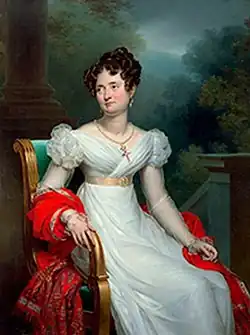 - Antoine Louis Octave de Choiseul Gouffier, émigré en Russie avec son père, participe à la prise de Varsovie par les russes en 1795 et reçoit l'ordre de Saint-Georges[31], chambellan de l'Empereur de Russie. En France, il est nommé en 1819 pair de France héréditaire à la suite de son père[32] (Paris, paroisse Saint Roch, - Florence, Toscane, ), marié en 1801 avec Victoria Potocka, puis en 1819 avec Sophie Clémence Victoire Tyzenhaus, écrivain d'origine lituanienne, demoiselle d'honneur de l'impératrice de Russie (1790-1878). Sa descendance du second mariage conserve le domaine de Plateliai en Samogitie, dans l'actuelle Lituanie, donné par l'Empereur de Russie, jusqu'en 1940 ; dont postérité en Russie, Lituanie, France, Roumanie, Allemagne, éteinte en ligne masculine en 1949, en ligne féminine en 1996 ;