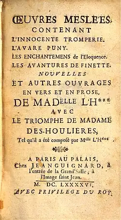 - Œuvres meslées : contenant L’innocente tromperie, L’avare puny, Les enchantemens de l’eloquence, Les avantures de Finette : nouvelles et autres ouvrages en vers et en prose (avec Le Triomphe de Madame Des-Houlieres, tel qu’il a été composé par Mlle L’H***), Paris, Jean Guignard, , 420 p., 28 cm (OCLC 703274324, lire en ligne).
