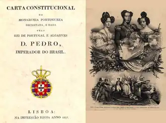 La couronne de Portugal est alors donnée à l'aînée de ses enfants, l'infante Maria da Gloria en 1826, tandis que la couronne brésilienne est destinée après lui à son unique fils Pierre (le futur Pierre II du Brésil), né en 1825. Afin d'éviter des troubles, l'empereur du Brésil fiance sa fille, qui n'a que sept ans, à son plus proche héritier : son frère cadet l'infant Michel, âgé de 23 ans. Cependant l'infant Michel prône des valeurs conservatrices, alors que l'empereur du Brésil se veut libéral. L'infant Michel détrône sa nièce deux ans plus tard (leurs fiançailles étant par la suite annulées)[1] et se proclame roi de Portugal à sa place, sous le nom de Michel Ier, en juin 1828.