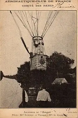 Brevetée pilote aéronaute le , c’est le que Mme Surcouf exécute à bord du ballon « Bengali », son premier vol en tant que pilote, accompagnée de Mlle Gache, la secrétaire du Comité. Ce vol, il s’agit du premier vol d’un équipage féminin, va mener les deux femmes du parc des Coteaux de Saint-Cloud, à Neuilly-sur-Marne et ce en 2h45 de vol.[11]