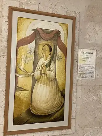 Une peinture la représente dans le Sanctuaire des Martyrs de Danggogae, à Séoul[2].