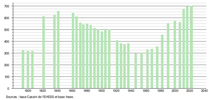 L'évolution du nombre d'habitants est connue à travers les recensements de la population effectués dans la commune depuis 1793. Pour les communes de moins de 10 000 habitants, une enquête de recensement portant sur toute la population est réalisée tous les cinq ans, les populations de référence des années intermédiaires étant quant à elles estimées par interpolation ou extrapolation[17]. Pour la commune, le premier recensement exhaustif entrant dans le cadre du nouveau dispositif a été réalisé en 2006[18].