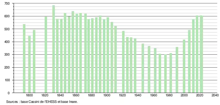 L'évolution du nombre d'habitants est connue à travers les recensements de la population effectués dans la commune depuis 1793. Pour les communes de moins de 10 000 habitants, une enquête de recensement portant sur toute la population est réalisée tous les cinq ans, les populations de référence des années intermédiaires étant quant à elles estimées par interpolation ou extrapolation[24]. Pour la commune, le premier recensement exhaustif entrant dans le cadre du nouveau dispositif a été réalisé en 2006[25].