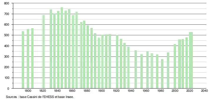 L'évolution du nombre d'habitants est connue à travers les recensements de la population effectués dans la commune depuis 1793. Pour les communes de moins de 10 000 habitants, une enquête de recensement portant sur toute la population est réalisée tous les cinq ans, les populations de référence des années intermédiaires étant quant à elles estimées par interpolation ou extrapolation[29]. Pour la commune, le premier recensement exhaustif entrant dans le cadre du nouveau dispositif a été réalisé en 2005[30].
