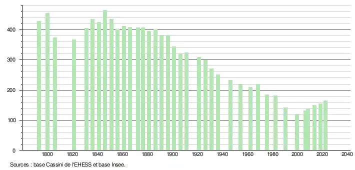 L'évolution du nombre d'habitants est connue à travers les recensements de la population effectués dans la commune depuis 1793. Pour les communes de moins de 10 000 habitants, une enquête de recensement portant sur toute la population est réalisée tous les cinq ans, les populations de référence des années intermédiaires étant quant à elles estimées par interpolation ou extrapolation[14]. Pour la commune, le premier recensement exhaustif entrant dans le cadre du nouveau dispositif a été réalisé en 2008[15].