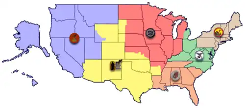 Aux fins du recrutement des Marines, les États-Unis sont divisés en deux régions. La région de recrutement de l'Est couvre principalement les districts à l'est du fleuve Mississippi. La région de recrutement de l'Ouest couvre principalement les districts à l'ouest du Mississippi.