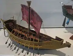 La structure des navires est particulièrement visible sur les reliefs du temple de Médinet Habou qui montrent la grande tentative d'invasion de l'Égypte par les Peuples de la mer. Ces reliefs nous montre les navires égyptiens, petits mais maniables, luttant contre les navires plus grands mais plus lents des Peuples de la mer[1]. Ils dépeignent les navires comme des plateformes à partir desquelles les archers et les frondeurs peuvent tirer sur l'ennemi. Une fois à bord, la plupart des membres de l'équipage des navires égyptiens s'armaient et se battaient en combat rapproché à l'aide de lances, de boucliers et de haches de combat. Le fait de disposer de navires aussi rapides et maniables permettait aux Égyptiens de harceler constamment l'ennemi à distance tout en se mettant à l'abri pour attaquer d'un autre côté. Cet usage a surtout existé au Nouvel Empire, même s'il a été utilisé au cours de la Deuxième Période intermédiaire, lors du siège d'Avaris par Ahmôsis Ier. Les Égyptiens abordaient d'autres navires en utilisant la méthode qui consiste à utiliser des grappins pour tirer un navire après l'avoir bombardé de flèches[3].