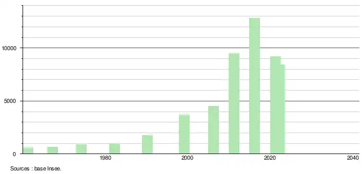 - ↑ Par convention dans Wikipédia, le principe a été retenu de n’afficher dans le tableau des recensements et le graphique, pour les populations de référence postérieures à 1999, que les populations correspondant à une enquête exhaustive de recensement pour les communes de moins de 10 000 habitants, et que les populations des années 2006, 2011, 2016, etc. pour les communes de plus de 10 000 habitants, ainsi que la dernière population de référence publiée par l’Insee pour l'ensemble des communes.