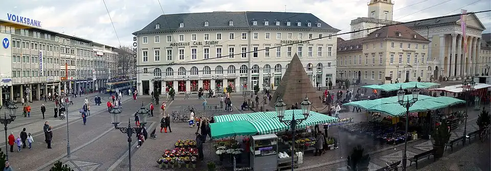 La place du Marché de Karlsruhe a été construite selon les plans de l'architecte badois Friedrich Weinbrenner, adepte du classicisme, et conçue comme un contrepoids bourgeois face à l'imposant château aristocratique. Les premières esquisses sont dessinées vers 1800 et mises en œuvre en 1807. Plusieurs bâtiments du côté Sud de la Lange Straße (aujourd'hui Kaiserstraße), au croisement de celles qui partent de la place du château (de) vers le sud, durent être démolis, dont le précédent hôtel de ville et l'église de la Concorde (de). Puisqu'il y avait une crypte avec les restes de Charles-Guillaume dans cette église, la ville a décidé de préserver la crypte et d'installer au-dessus un monument funéraire en forme de pyramide[1]. L'on construit d'abord une pyramide de bois temporaire, remplacée par une construction en pierre en 1823. Les deux ont été conçues par Weinbrenner. Dans les années 1820, plusieurs bâtiments ont été construits sur la place du Marché, surtout l'église de la Cité (1807-1816), pour les luthériens, et le nouvel hôtel de ville (1805-1825).