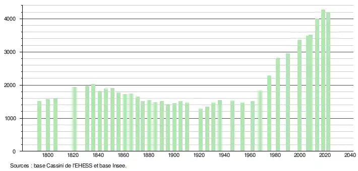 L'évolution du nombre d'habitants est connue à travers les recensements de la population effectués dans la commune depuis 1793. Pour les communes de moins de 10 000 habitants, une enquête de recensement portant sur toute la population est réalisée tous les cinq ans, les populations de référence des années intermédiaires étant quant à elles estimées par interpolation ou extrapolation[29]. Pour la commune, le premier recensement exhaustif entrant dans le cadre du nouveau dispositif a été réalisé en 2008[30].