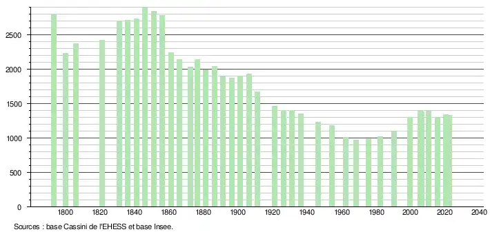 L'évolution du nombre d'habitants est connue à travers les recensements de la population effectués dans la commune depuis 1793. Pour les communes de moins de 10 000 habitants, une enquête de recensement portant sur toute la population est réalisée tous les cinq ans, les populations de référence des années intermédiaires étant quant à elles estimées par interpolation ou extrapolation[21]. Pour la commune, le premier recensement exhaustif entrant dans le cadre du nouveau dispositif a été réalisé en 2005[22].