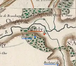 La carte de Cassini montre qu'au XVIIIe siècle, Marly est une paroisse située sur la rive gauche de l'Oise. À l'ouest, Gomont est un hameau sur les hauteurs de la vallée de l'Oise. Au sud (à 5 km), le hameau de Bechaué comprend deux fermes actuellement et est partagé avec le terroir de la commune d'Haution.