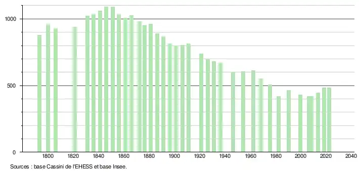 L'évolution du nombre d'habitants est connue à travers les recensements de la population effectués dans la commune depuis 1793. Pour les communes de moins de 10 000 habitants, une enquête de recensement portant sur toute la population est réalisée tous les cinq ans, les populations de référence des années intermédiaires étant quant à elles estimées par interpolation ou extrapolation[38]. Pour la commune, le premier recensement exhaustif entrant dans le cadre du nouveau dispositif a été réalisé en 2008[39].