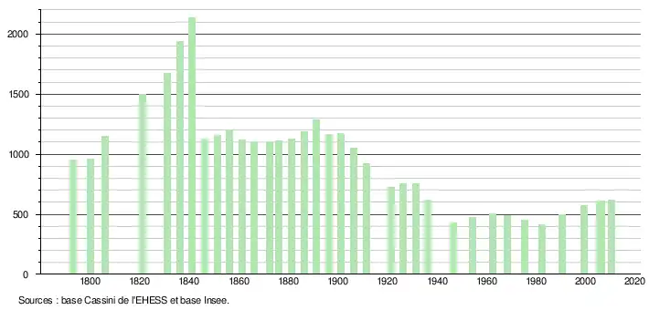 L'évolution du nombre d'habitants est connue à travers les recensements de la population effectués dans la commune depuis 1793. À partir du , les populations légales des communes sont publiées annuellement dans le cadre d'un recensement qui repose désormais sur une collecte d'information annuelle, concernant successivement tous les territoires communaux au cours d'une période de cinq ans. Pour les communes de moins de 10 000 habitants, une enquête de recensement portant sur toute la population est réalisée tous les cinq ans, les populations légales des années intermédiaires étant quant à elles estimées par interpolation ou extrapolation[2]. Pour la commune, le premier recensement exhaustif entrant dans le cadre du nouveau dispositif a été réalisé en [3],[Note 1].