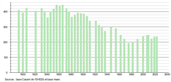 L'évolution du nombre d'habitants est connue à travers les recensements de la population effectués dans la commune depuis 1793. Pour les communes de moins de 10 000 habitants, une enquête de recensement portant sur toute la population est réalisée tous les cinq ans, les populations de référence des années intermédiaires étant quant à elles estimées par interpolation ou extrapolation[21]. Pour la commune, le premier recensement exhaustif entrant dans le cadre du nouveau dispositif a été réalisé en 2008[22].