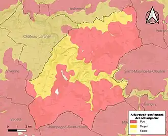 Les mouvements de terrains susceptibles de se produire sur la commune sont des affaissements et effondrements liés aux cavités souterraines (hors mines) et des tassements différentiels[22]. Afin de mieux appréhender le risque d’affaissement de terrain, un inventaire national permet de localiser les éventuelles cavités souterraines sur la commune[23]. Le retrait-gonflement des sols argileux est susceptible d'engendrer des dommages importants aux bâtiments en cas d’alternance de périodes de sécheresse et de pluie[24]. 99,6 % de la superficie communale est en aléa moyen ou fort (79,5 % au niveau départemental et 48,5 % au niveau national)[Carte 2]. Depuis le , en application de la loi ÉLAN, différentes contraintes s'imposent aux vendeurs, maîtres d'ouvrages ou constructeurs de biens situés dans une zone classée en aléa moyen ou fort[Note 3],[25].