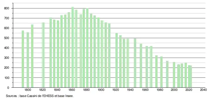 L'évolution du nombre d'habitants est connue à travers les recensements de la population effectués dans la commune depuis 1793. Pour les communes de moins de 10 000 habitants, une enquête de recensement portant sur toute la population est réalisée tous les cinq ans, les populations de référence des années intermédiaires étant quant à elles estimées par interpolation ou extrapolation[21]. Pour la commune, le premier recensement exhaustif entrant dans le cadre du nouveau dispositif a été réalisé en 2005[22].