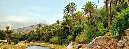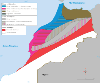 Le Maroc se compose de zones montagneuses ou désertiques, et il est un des seuls pays — avec l'Espagne et la France — à comporter des rivages sur la mer Méditerranée d'un côté et l'océan Atlantique de l'autre. Sa population est de près de 37 millions d'habitants en 2023 et sa superficie de 446 550 km2[26] (76,84 hab./km2), ou de 710 850 km2 en incluant le Sahara occidental[27],[28] — ex-« Sahara espagnol », considéré comme un territoire non autonome par l'Organisation des Nations unies[1] — dont il administre de facto environ 80 % et qu'il revendique dans sa totalité, tout comme le Front Polisario sous le nom de République arabe sahraouie démocratique. Sa culture est arabo-berbère depuis plusieurs siècles et s'est étendue principalement au Maghreb et dans le Sud de l'Espagne.