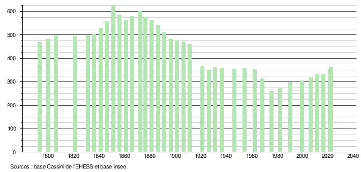 L'évolution du nombre d'habitants est connue à travers les recensements de la population effectués dans la commune depuis 1793. Pour les communes de moins de 10 000 habitants, une enquête de recensement portant sur toute la population est réalisée tous les cinq ans, les populations de référence des années intermédiaires étant quant à elles estimées par interpolation ou extrapolation[19]. Pour la commune, le premier recensement exhaustif entrant dans le cadre du nouveau dispositif a été réalisé en 2006[20].