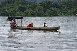 Tout au long de son cours se succèdent villages Bushinengué (Boni, Djukas, Paramaccans, Saramacas) et Amérindiens (Lokonos, Kali'nas, Wayanas, Tekos). Pour ces communautés situées à l'intérieur de la Guyane française le Maroni est une voie de communication essentielle. En l'absence de voie de communication routière la pirogue constitue le principal moyen de transport de la région. Au départ de Saint-Laurent-du-Maroni plusieurs sociétés, basées à Saint-Laurent, proposent leurs services pour le transport fluvial, tant du fret que des passagers, sur le Maroni, toutefois sans lignes régulières[8]. Les pirogues du Maroni se comptent par centaines. Elles restent le seul moyen de transport pour les riverains du fleuve. Les Amérindiens naviguent uniquement dans l'estuaire sur des pirogues larges et se terminant par une haute étrave. Les Bushinenge, population issue des anciens esclaves du Surinam, construisent des pirogues adaptées au passage des rapides. Étroites et longues, elles possèdent des extrémités curvilignes. Il est à noter que les pirogues à moteur et les canots-pagaies sont ornés d'entrelacs appelés tembé et de décorations d'inspiration moderne[9].