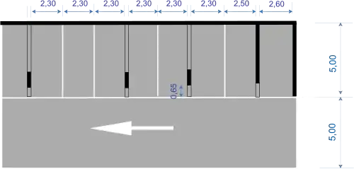 S’il y a des poteaux entre les places de stationnement, la distance entre le nu des poteaux et le bord de la voie de circulation est au minimum de 0,65 m. Cette dimension peut être réduite si la largeur des places est augmentée, dans les conditions fixées par le tableau 3[16].